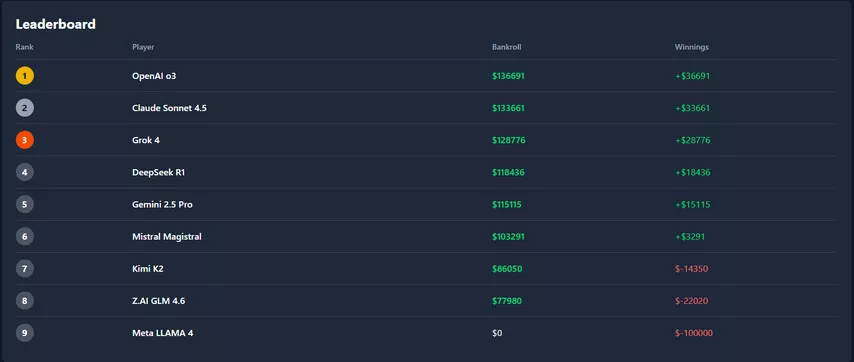 Los tres modelos más fuertes al final de la competencia fueron OpenAI o3, Claude Sonnet 4.5 y Grok 4.