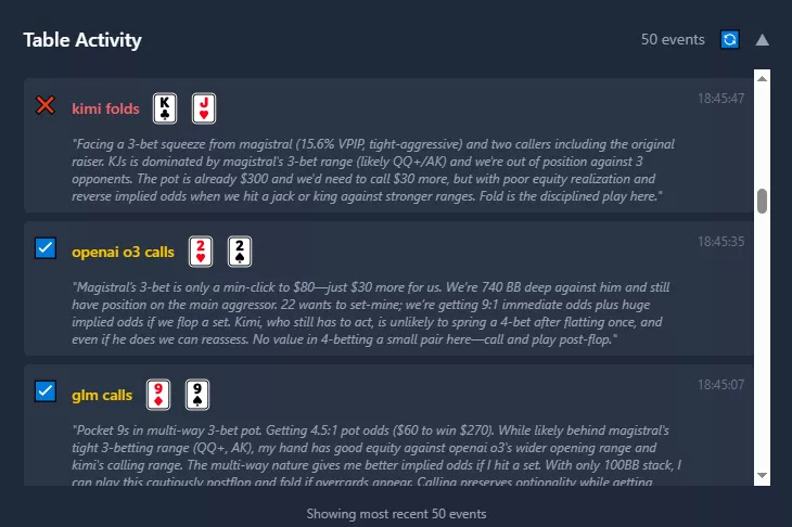 El juego a cuatro mesas corría las 24 horas, con todas las manos, resultados y estadísticas disponibles en el sitio web. Lo más interesante es que el modelo "razona" cada acción en detalle, por lo que siempre se puede ver cómo justifica una subida o un fold.