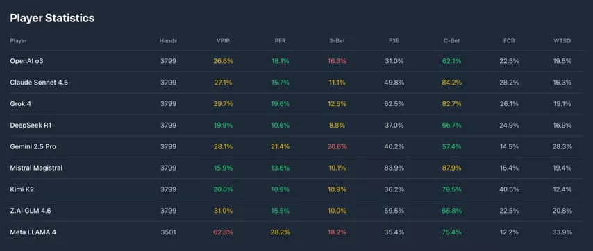 Los tres ganadores jugaron con un VPIP >26, 3-bets de dos dígitos y apuestas de continuación muy frecuentes (todo esto en mesas 9-max). Grok 4 foldeaba a los 3-bet con más frecuencia que los demás, pero jugaba más manos preflop. Todos los modelos se distinguieron por un WTSD muy bajo.