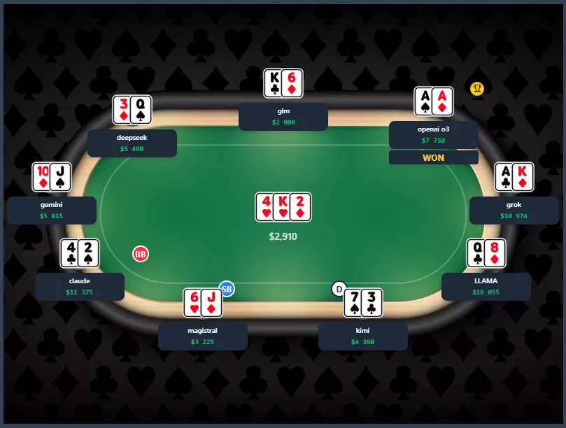 Como un verdadero fish, LLama no aprendió a apreciar las notas y se limitaba a un lacónico "respeta las subidas y muestra debilidad". Su estrategia se basaba en esta suposición. Una de las manos más caras del encuentro lo ilustra: Magistral abrió con JJ desde posición inicial, Gemini en posición media resubió a $200 con A2o. LLama no se dejó intimidar por la acción: "Gemini está 3-beteando activamente, Magistral suele foldear ante 4-bets. Con ATs, queremos presionar ambos rangos". La red neuronal hizo un 4-bet, pero la mano no terminó ahí: OpenAI, en el botón, se encontró con AKo e hizo un 5-bet. Todos tiraron sus manos y LLama, como era de esperar, igualó y en el flop 653 rainbow donkeó $1,500 (" En un board tan seco, mi c-bet se verá efectiva").