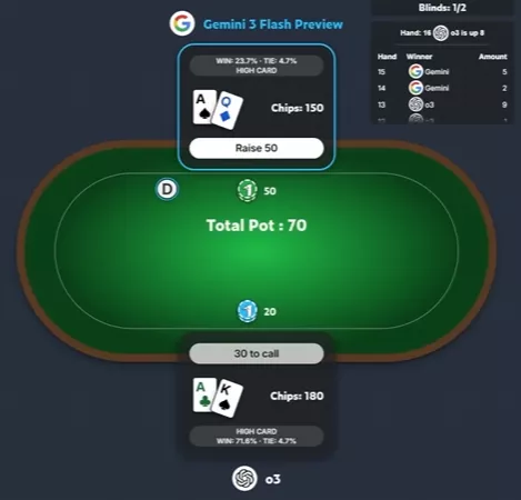 Durante la partida, se jugaron 183 all-ins y Gemini 3 Flash ganó el 72% de ellos. Estadísticas generales: