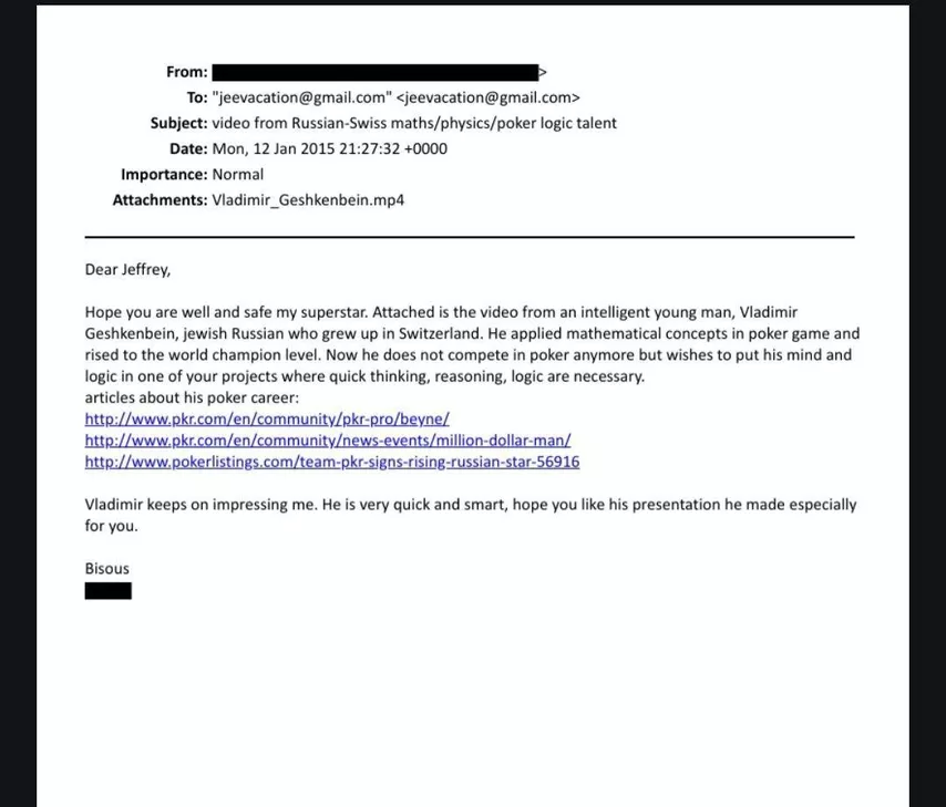 En 2015, Vladimir solicitó un empleo en Epstein y preparó una presentación en video. La carta de recomendación describía a Geshkenbein como «un hombre capaz de aplicar conceptos matemáticos al poker y alcanzar el nivel de campeón».