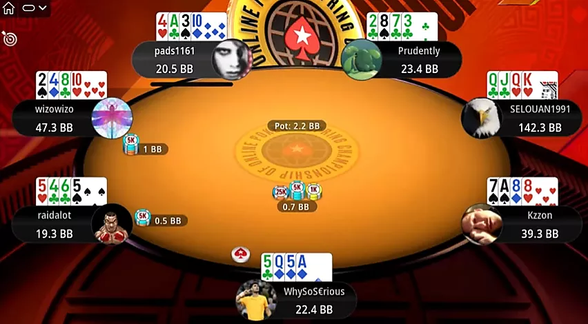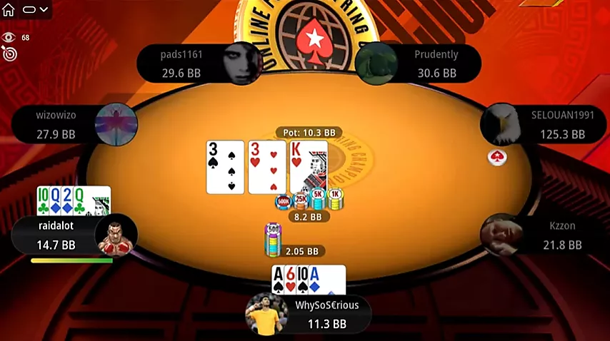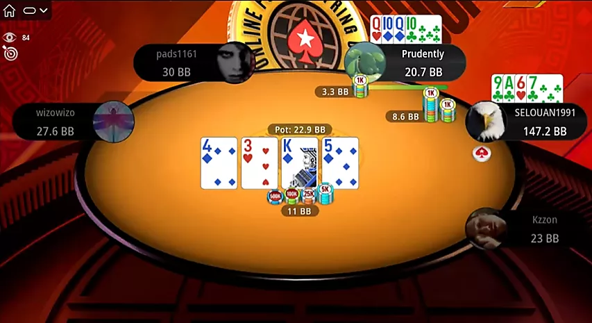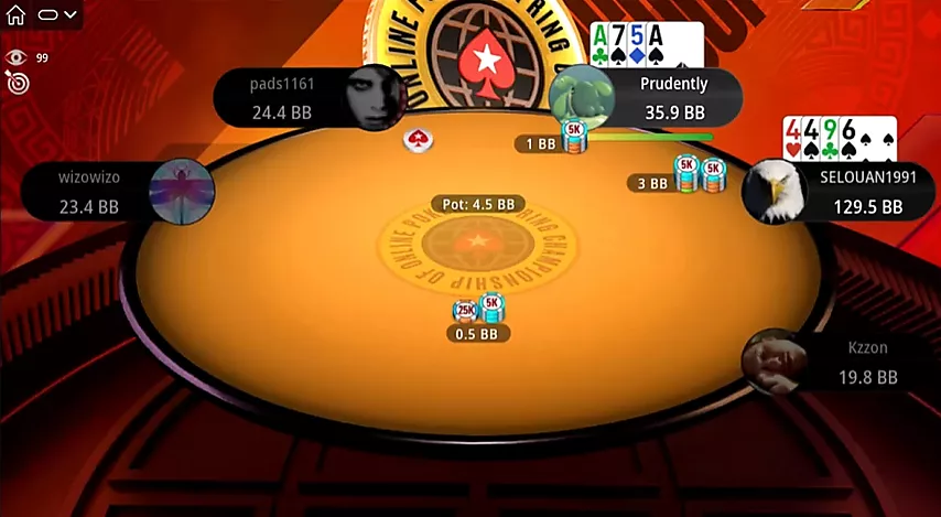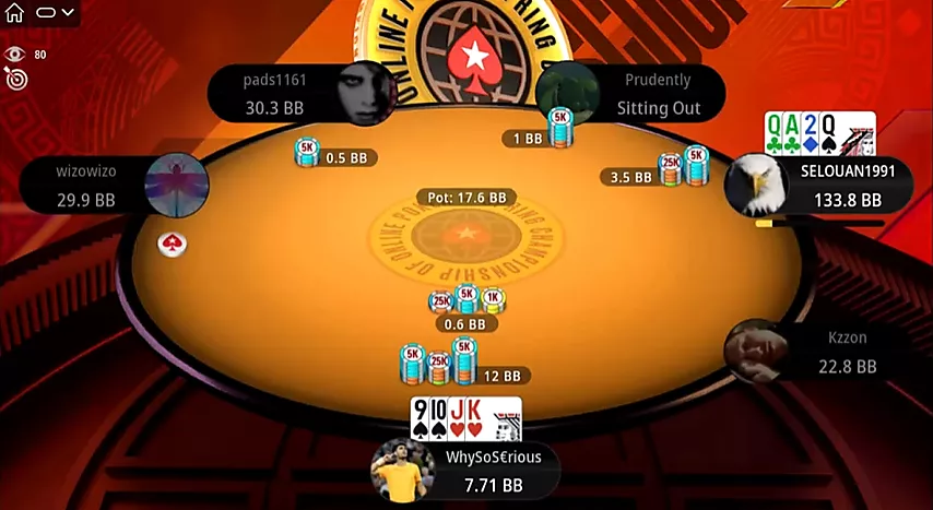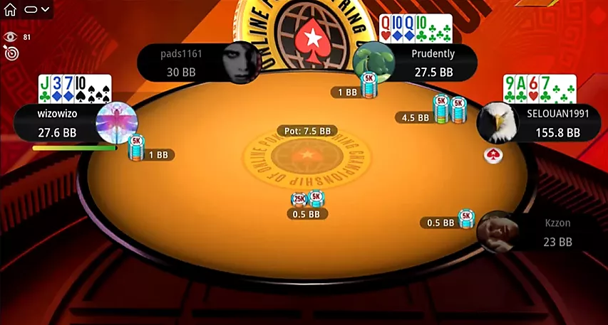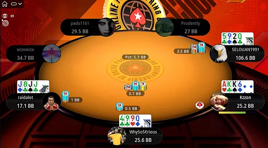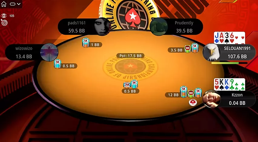 Al comienzo de una nueva ronda, Selouan abre una mano optimista desde UTG: . Pero esta vez a uno de sus oponentes le reparten ases. Kzzon, evaluando la situación, resube el bote, lo cual es suficiente para ganar.