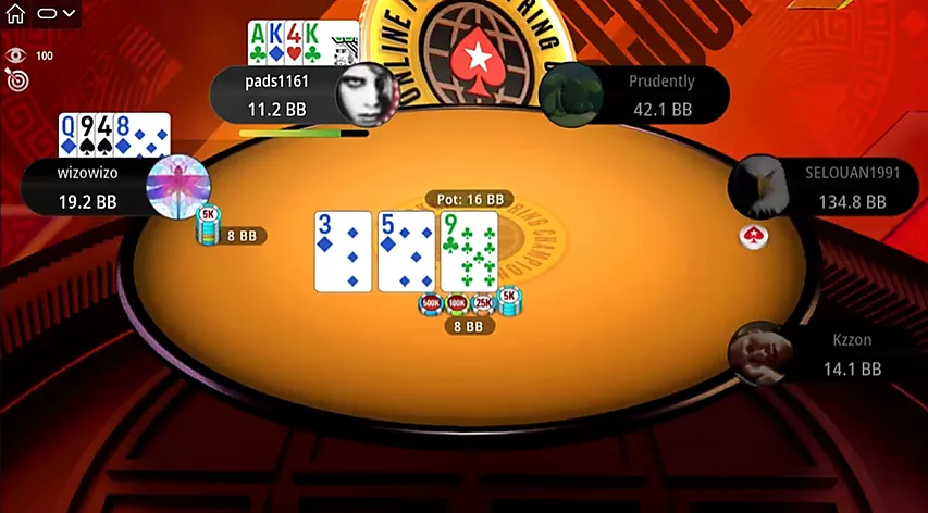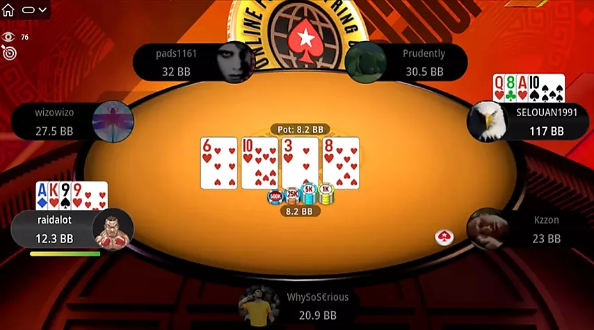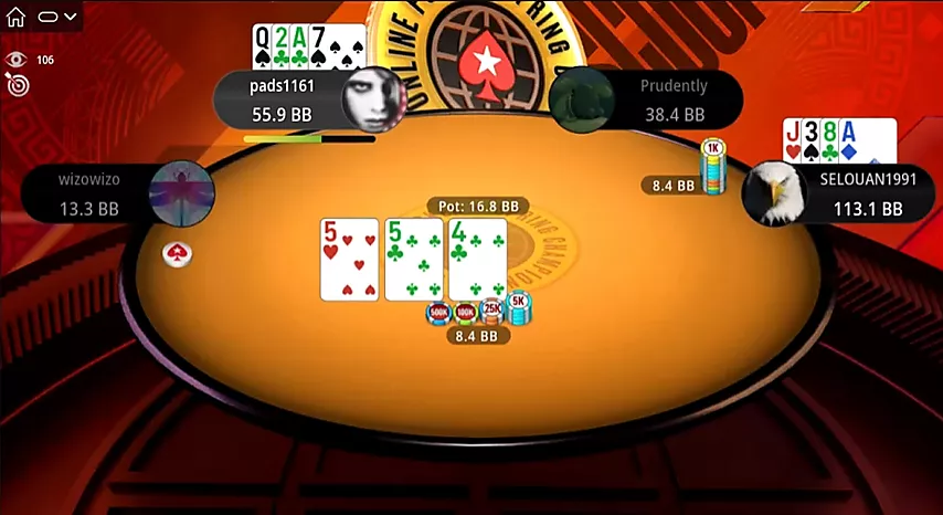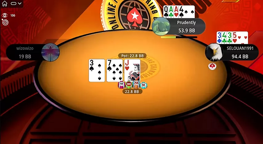 ¡Un flop muy competitivo! Prudently pasa. Selouan apuesta el bote con dos pares muy vulnerables. Con un top pair y un proyecto de color a las segundas nuts, por supuesto, no puede foldear y opta por ir all-in.