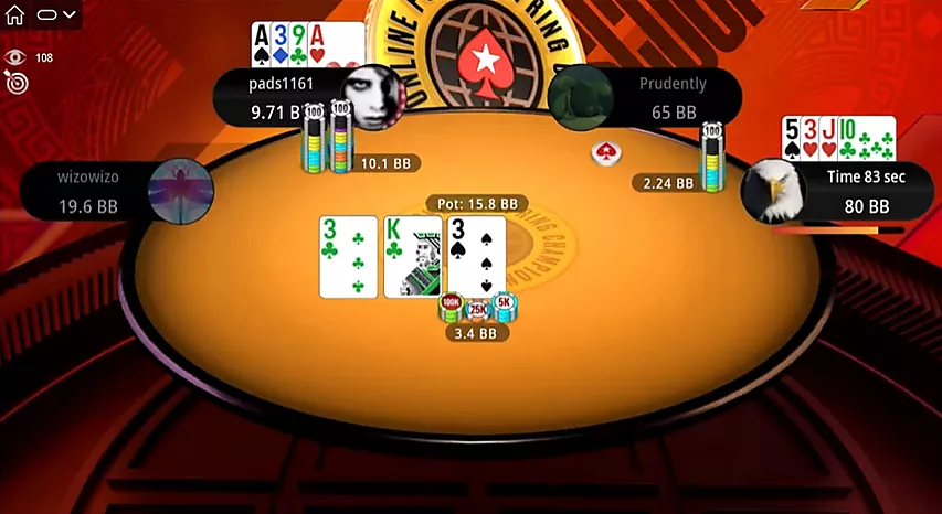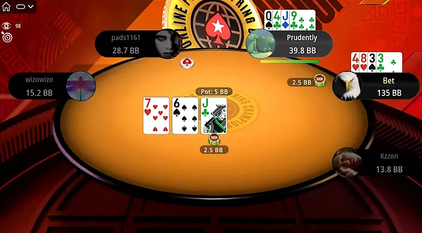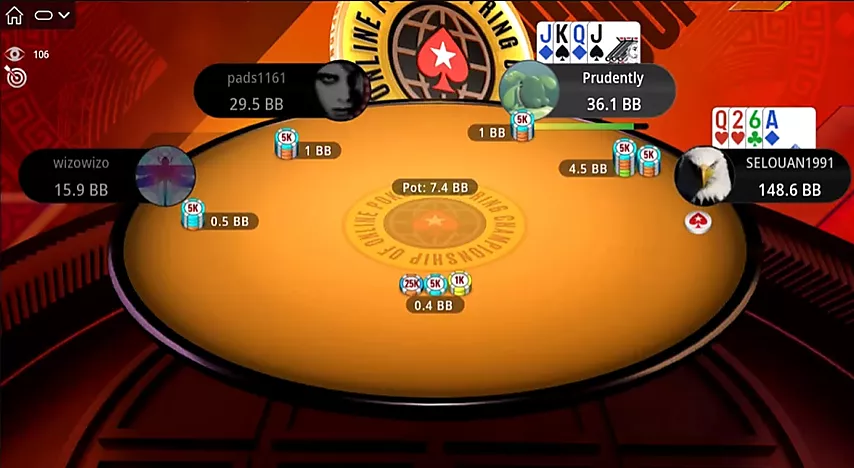 Preflop, Selouan abre desde el botón con y paga el 3-bet de Prudently. El flop no decepciona.