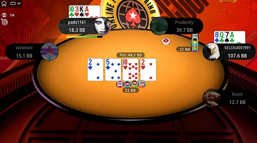 En el flop ambos jugadores pasan; Selouan es bastante cauteloso postflop. El turn es un y Prudently apuesta 3.3 bb, aproximadamente un tercio del bote. Selouan... hace algo inesperado.
