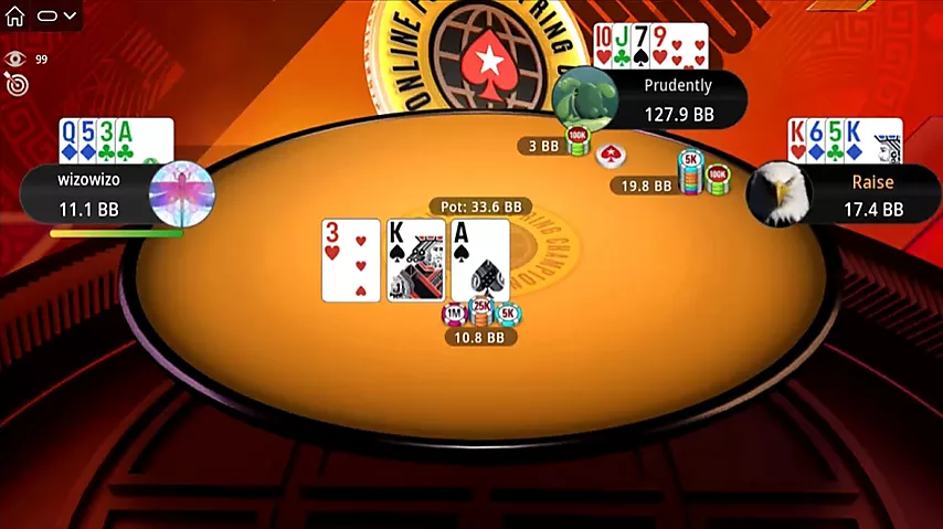 Este limp con una mano obviamente muy fuerte demuestra que Prudently, un jugador top de cash en Omaha, no solo comprende los desafíos que presenta el ICM, sino que también los toma en serio. Schemion se retira ante la apuesta inicial de Selouan en la ciega grande, y Prudently iguala.