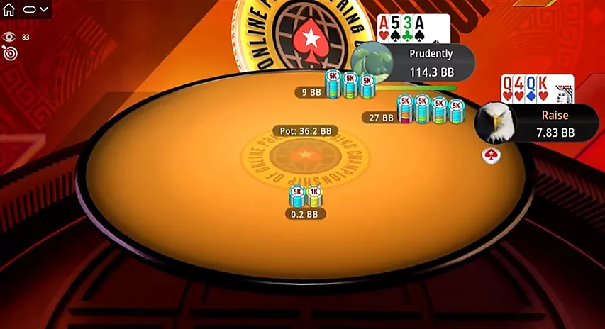 Turn: , river: . Prudently consigue un bote enorme y se convierte en el nuevo líder en fichas.