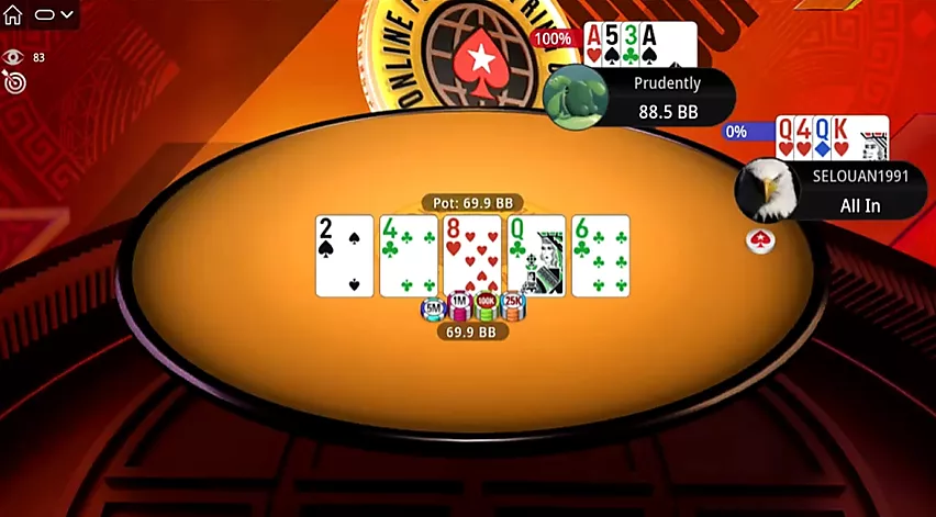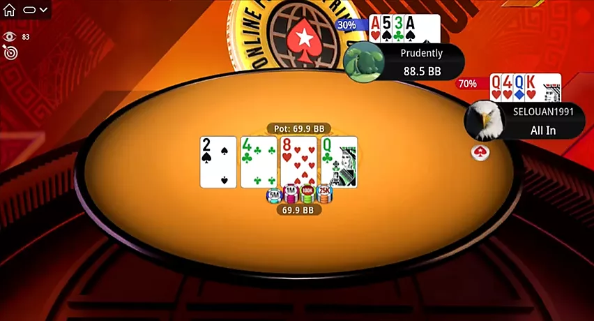 El enfrentamiento es inevitable. Prudently, fuera de posición, se compromete con el bote haciendo una apuesta de continuación máxima. Selouan va all-in con un set y una gutshot. Su oponente iguala. La equity es del 67% contra el 33%, con el set obviamente por delante.