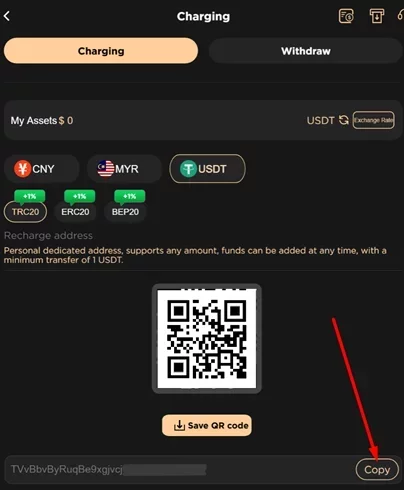 - Seleccione un método de recarga, por ejemplo, USDT.