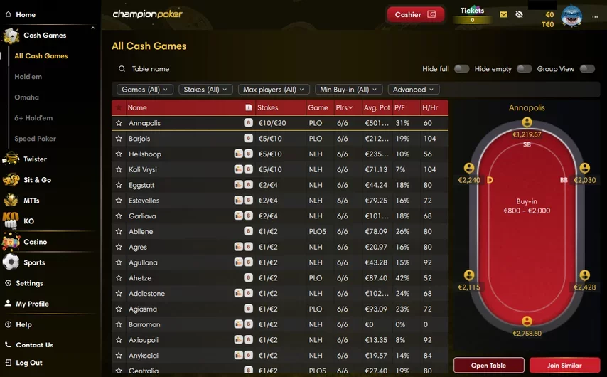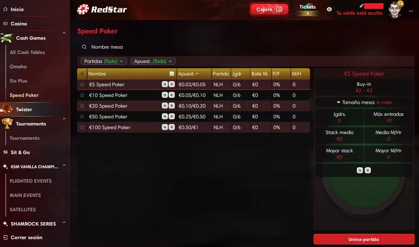 En el lobby de cash hay mesas desde €0.01/€0.02 hasta €25/€50. Hay poker short deck y también Omaha, incluyendo mesas de heads-up. El tráfico principal en RedStar Poker llega después de las 17:00 CEST. Para cada mesa está disponible la opción Run It Twice: el board se puede correr dos veces.