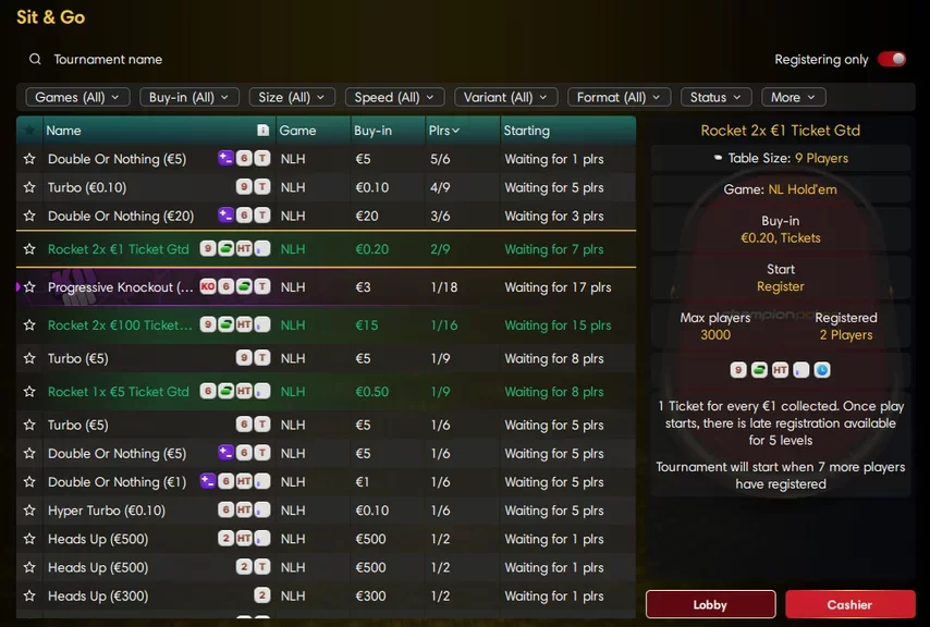 Los Sit & Go comienzan en €0.1 y están disponibles en formatos turbo e hyper-turbo. También existe Double or Nothing: aquí usted o duplica la entrada o se queda sin nada.