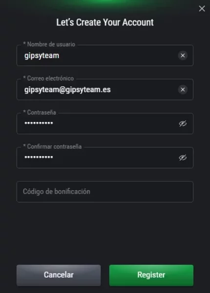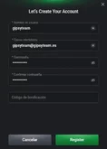 - Complete el formulario: escoja un nickname y una contraseña, indique su correo electrónico y, si lo hay, ingrese un código promocional. Recomendamos usar el código GTES para acceder a nuestras futuras promociones exclusivas.