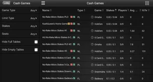 En el lobby hay disponibles mesas 6-max y 9-max. También hay mesas heads-up. Las ciegas comienzan en $0.01/$0.02 y llegan hasta $5,000/$10,000 (en fichas).
