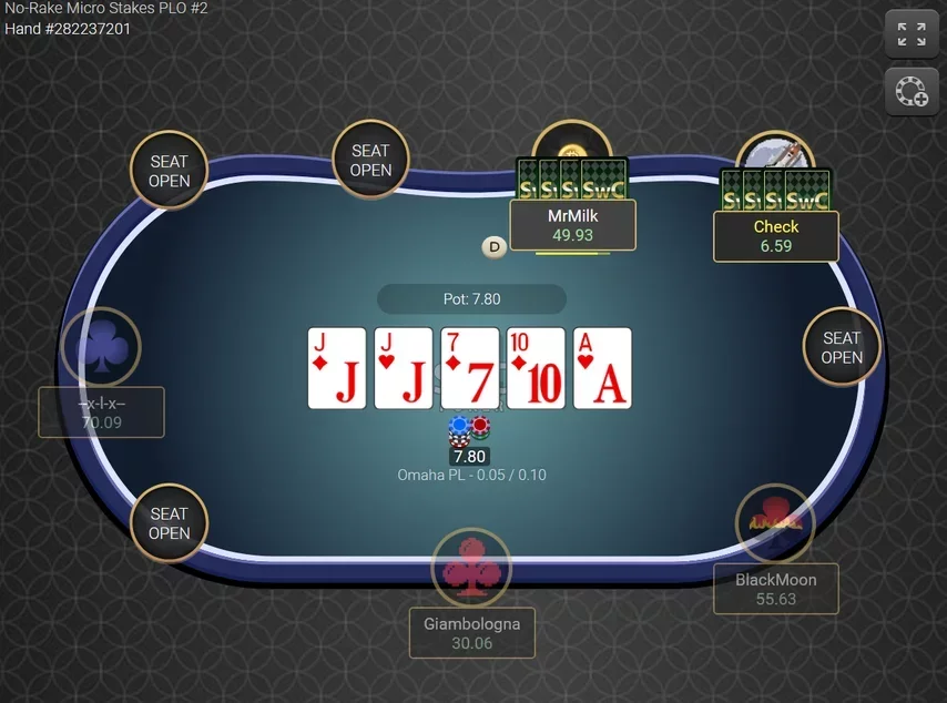 Está disponible la función Run It Twice, que permite repartir el board dos veces. Las mesas vinculadas al Bad Beat Jackpot representan menos del 10% de todas las mesas cash. No hay juegos con ante ni straddle; tampoco existe un formato de fast-fold para cash ni un modo de práctica con fichas ficticias.