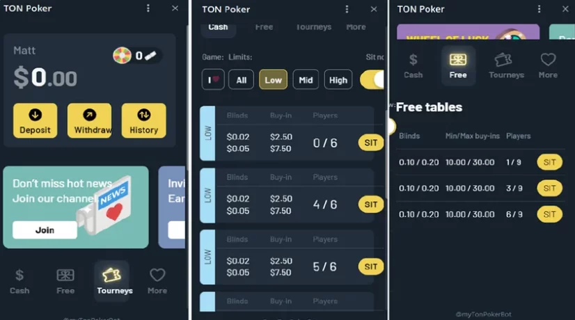 Con un solo clic accederás al lobby, que es muy fácil de navegar. Cuando abras TON Poker a través del enlace de Telegram, verás cuatro botones de navegación: “Cash, Free, Tourneys, More”. Estos te llevarán a las partidas y a cosas como el programa de afiliados.