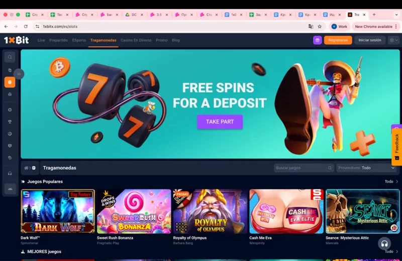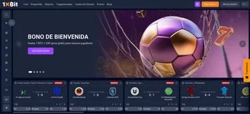El sitio web de 1xBit está diseñado en agradables tonos azul oscuro con toques del característico naranja. En la esquina superior derecha están los botones de inicio de sesión y registro. La navegación por el portal es sencilla gracias a 7 pestañas: Live, Prematch, E-Sports, Slots, Live-Casino, Promo, Blog. En ocasiones añaden secciones temporales dedicadas a promociones actuales, como Halloween Gift Town o Tower Lewelling.