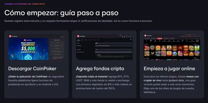 Con más de 50,000 usuarios activos, CoinPoker se ha consolidado como una plataforma moderna para jugadores familiarizados con las criptomonedas que valoran la velocidad, la seguridad y el anonimato. Desde 2017, el proyecto reúne en una experiencia fluida la infraestructura blockchain, una política que prioriza la privacidad y el juego con dinero real. Su enfoque crypto se refleja en un registro instantáneo sin KYC, pagos rápidos y una estructura de bonos competitiva. En esta reseña les contaremos sobre el bono de bienvenida, el catálogo de juegos, la aplicación móvil y sus opciones de descarga, además del sistema de soporte y su comparación con la competencia. En algunas comunidades también se le llama Coin Poker, y se presenta como un casino online con funciones adicionales de apuestas.