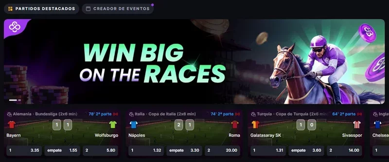 La sección de Sportsbook de CoinCasino funciona como una casa de apuestas completa, no solo como un extra dentro de una app de poker. Su principal ventaja es la profundidad de mercados: permite hacer apuestas deportivas sobre más de 50 disciplinas en casi 100 países, incluyendo ligas menores y competiciones de nicho que no siempre aparecen en otras marcas crypto. Como casa de apuestas, CoinCasino sirve para mantener acción constante entre rondas de casino o sesiones de poker.