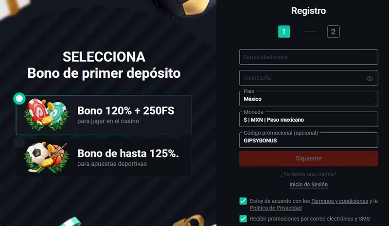 2. En la ventana de registro, ingrese todos sus datos: correo electrónico, contraseña y moneda. En este paso, debe seleccionar qué tipo de bono quiere recibir por su primer depósito: un bono del 120% y 250 giros gratis para jugar en el casino, o un bono de hasta el 125% para apuestas deportivas. Para recibir todos los beneficios disponibles, ingrese el código promocional GIPSYBONUS en el campo indicado.